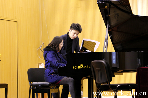 贾然对我院青年教师李晓莹和田径弹奏的舒伯特c小调奏鸣曲(D.958)及降G大调即兴曲 (D.899 NO.3)进行了细致地现场指导。她对舒伯特即兴曲的和声、小句法以及内声部的变化做了主要讲解,她指出,在rubato的处理上,不能太过随意,应该遵循大句法以及曲式结构的规则,来适当的加入rubato。另外,在指导c小调奏鸣曲时,她从作品背景解读、作品版本选择、以及音响版本选择几个方面提出了自己的见解。读谱过程中,需要再仔细,再细腻的去处理每个小句法、细微和声变化、其中的大幅度的强弱变化,以及埋藏在旋律及和声深处的与命运搏斗旋律动机。
