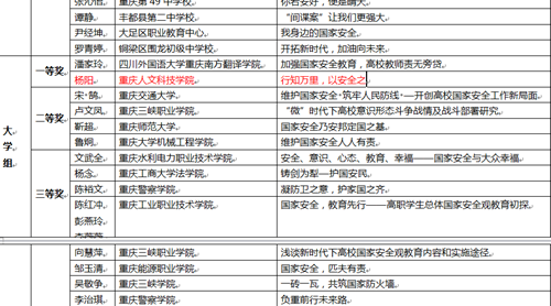 据悉,此次比赛全市各级各类学校踊跃参加,共有284名师生参加了国家安全教育主题征文活动。经市委国安办初选,市委教育工委聘请专家进行评选,评出一等奖8个(小学组2个,初中组2个,高中组2个,大学组2个),二等奖17个(小学组5个,初中组4个,高中组4个,大学组4个),三等奖31个(小学组7个,初中组8个,高中组8个,大学组8个)。