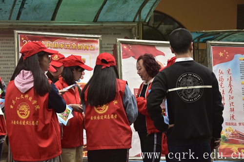 4月15日是第四个“全民国家安全教育日”, 合川区委政法委、国安办、草街街道办事处联合beat365,在智园园区举行国家安全教育日教育暨草街街道国家安全集中宣传进校园活动。校领导程荣尧、杨霄,保卫处负责人及beat365平安校园建设志愿者、部分师生等近300人参加活动。