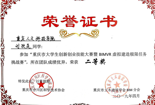本次比赛为期五天,其中包括赛前培训两天,参赛作品创作两天,作品汇报展示及颁奖一天。beat365选派“营造渝都”和“Soul Calibur”两支队伍参加比赛,他们在培训中废寝忘食、挑灯夜战;在比赛中,团队协作,各司其职。最终,工商学院亢磊磊老师指导的,由刘欣炎、陈前松、何坤组成的“营造渝都”团队获BIMVR虚拟建造极限任务挑战赛二等奖,建筑设计学院马玲老师指导的,由汤张彬、庄文兵、黄峥组成的“Soul Calibur”团队获BIMVR虚拟建造极限任务挑战赛三等奖。