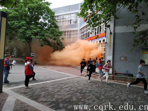 16时35分,演练正式开始,演练模拟两名“犯罪分子”在学校食堂实施纵火,瞬间火光冲天,烟雾弥漫。食堂员工立即拨打火警电话报警,同时工作人员向同学们发出紧急撤离的指示,随后在安全引导员的带领下,400余名师生用湿毛巾或浸湿的衣物捂住口鼻,弯腰低身,有序快速地撤离火灾现场到安全区域。同时,学校在接到火警报警后立即启动反恐、火灾应急预案,学校保卫处保安大队即刻赶往现场实施警戒封锁现场、搭建救灾点、制服了两名纵火“犯罪分子”并搜救转移伤员。与此同时校消防队、合川消防支队赶来控制火情并迅速扑灭火灾,校医院赶到后立即紧急施救并将重伤员即刻送往医院救治。安全引导员在仔细检查完各楼层人员全部疏散后撤离事发现场并宣布人员疏散结束。整个过程历时30分钟左右,一气呵成,精彩的表现得到现场观摩师生的热烈的掌声。