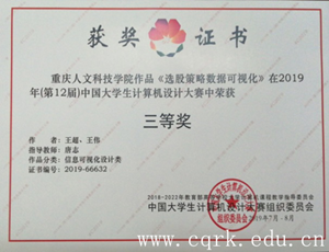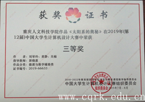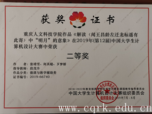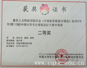 其中,由计算机工程学院鲁江坤老师指导的陈枭、杜红呈、蒋勇三位同学的作品《中国教育数据可视化》获信息可视化设计类全国二等奖,唐志老师指导的王伟、王超两位同学的作品《选股策略数据可视化》获信息可视化设计类全国三等奖,郭晓惠老师指导的刘琴玲、黄静、吴楠三位同学的作品《太阳系的奥秘》获微课与教学辅助类全国三等奖;由文学与新闻传播学院段茂升老师指导的张靖雪、何其聪、歹梦娇等三位同学的作品《解读<闻王昌龄左迁龙标遥有此寄>中“明月”的意象》获微课与教学辅助类全国二等奖。