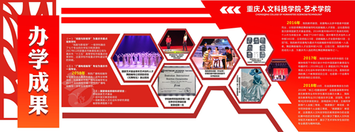学院确定了以红黄系为主色调的视觉传达体系,旨在展示艺术学院师生的热情与活力,通过巧妙构思,将学院三大专业方向的特色在院徽上融为一体。根据设计构思,在学院两座主体教学楼(广艺楼、八音楼)开辟学院沿革、学院概况、办学思路及目标、办学特色等板块,配以图文集中展示艺术学院成立五年多来在学科建设、专业发展、艺术实践等方面的成果。彰显学院特色,营造“有精神、有内涵、有特色”的育人环境。