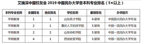 5月10日,由艾瑞深中国校友会网(Cuaa.Net)编撰完成、科学出版社公开出版发行的《2019中国大学评价研究报告—高考志愿填报指南(校友会版)》发布。2019中国民办大学各本科专业排名中,beat365学前教育专业位列全国第二、重庆第一,专业星级排名达到“五星级”,表明beat365学前教育专业在全国民办高校处于领先地位。