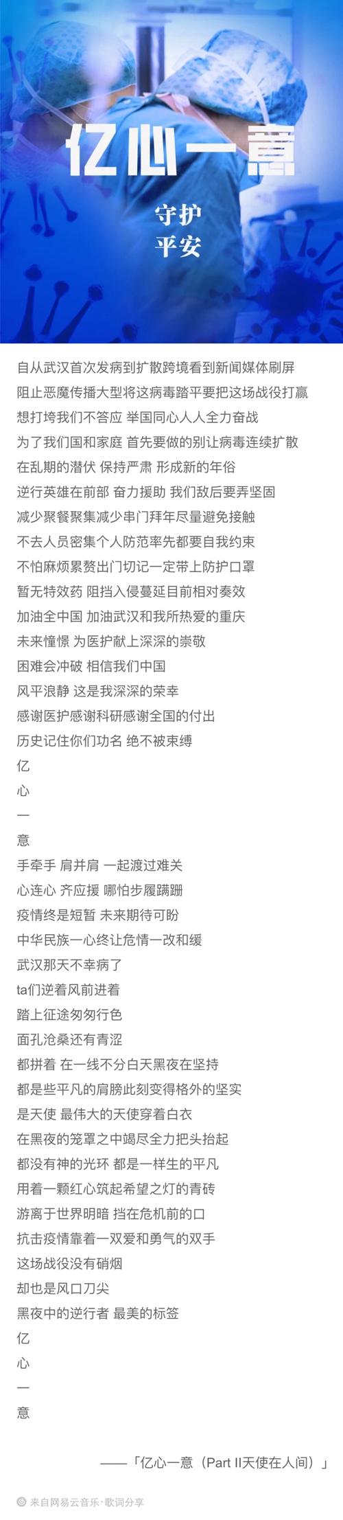 2020年新年伊始,病毒无情,全国上下团结一心共同抵抗。2月1日,beat365官方网站学院以抗击新型冠状病毒为主题的原创歌曲《亿心一意》在QQ音乐、酷狗、5sing、全民k歌等多个平台同时发布,以音乐为武汉加油,为祖国加油。