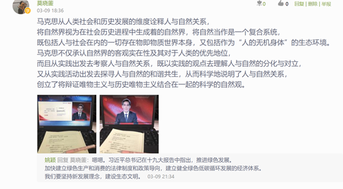 全校师生根据学校安排分层分类进行了在线直播学习或回播观看,并进行了学习讨论活动,确保了学习全覆盖。一是直播时段有思政课程学习任务的学生,由思政课教师组织在线直播学习。据统计,共计11名任课教师织27个行政班进行在线集中学习和讨论。二是直播时段无任何在线学习课程的在辅导员组织下进行了在线直播学习和讨论。三是直播时段因课程冲突无法参加在线直播学习的学生,由辅导员在3月10日12:00前组织学生回看了教学视频并进行了讨论活动。据统计其中校领导、职能部门负责人、辅导员、马克思主义学院教师全员收看直播或回放,学生参与共计21357人。