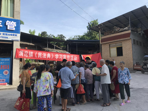 图为2017级学生谭富元(左七)在合川区渭沱镇开展宣传学习《民法典》活动