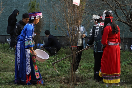 民族团结一家亲,同心共植一片林。为将民族文化元素融入校园文化建设,建设展现民族团结、民族风貌的系列校园景观,丰厚校园文化底蕴,发挥环境育人作用,11月9日下午,学校第十七届民族节系列活动在行知楼前园地开展了“民族团结林”植树活动。校长张跃光、党委书记张辉,校领导杨霄、舒卫华、孙敏,学校高级顾问何向东及二级党组织师生代表共100余人参加活动。