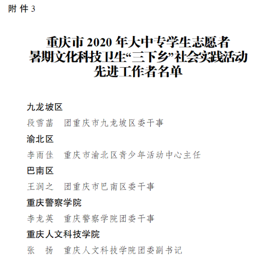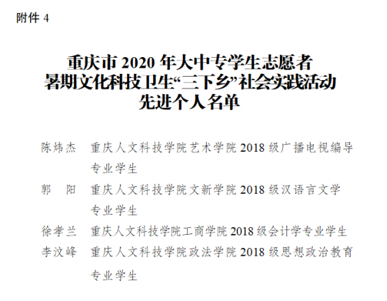 近日,中共重庆市委宣传部、重庆市精神文明建设委员会办公室、中共重庆市委教育工作委员会、重庆市教育委员会、共青团重庆市委员会、重庆市学生联合会联合发布了《关于重庆市2020年大中专学生志愿者暑期文化科技卫生“三下乡”社会实践活动的通报》,校团委荣获“优秀单位”称号,行知天元电商服务团等2支实践团队获“优秀团队”称号,校团委张扬老师获“先进工作者”称号,工商学院2018 级会计学专业学生徐孝兰等4名同学获“先进个人”称号。