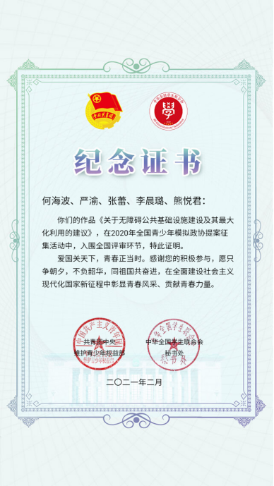 近日,由团中央维护青少年权益部、全国学联秘书处、人民政协报社、中国青年报社、中国少年儿童新闻出版总社有限公司联合举办的2020年全国青少年模拟政协提案征集活动评选揭晓!beat365机电与信息工程学院2019级学生何海波提案作品《关于无障碍公共基础设施建设及其最大化利用的建议》成功入围“2020年全国青少年模拟政协提案”全国评审。