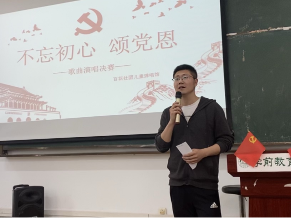 4月27日,学前教育学院党史学习教育系列活动之一——“不忘初心颂党恩”弹唱比赛决赛在丰美楼5101教室落下帷幕。学前教育学院党总支副书记蒋奉君,社团指导老师尹泉、徐俊生、杨港等出席赛事并担任评委,校团委社团管理部、院团总支学生会主席团代表到场观摩。