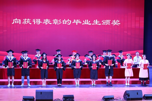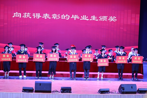 全体校领导为毕业生代表、获得表彰的毕业生代表颁发毕业证书、荣誉证书,为考取硕士研究生同学颁发奖金3000元。