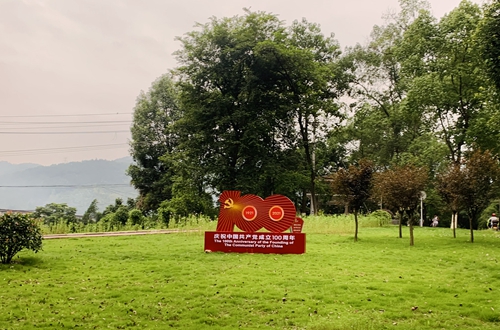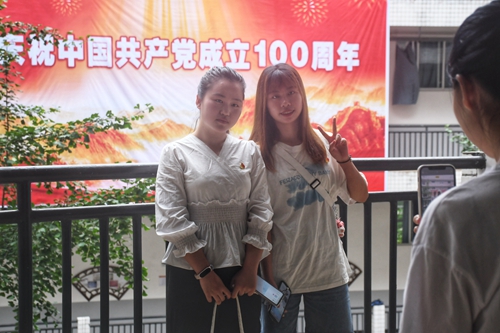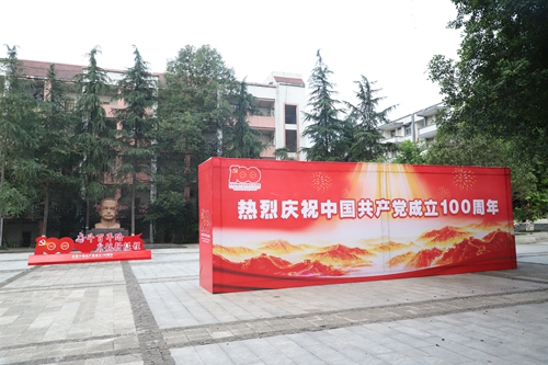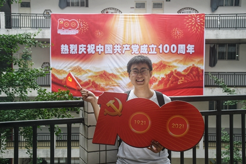 文学与新闻传播学院悬挂的巨型标语“热烈庆祝中国共产党成立100周年”前,师生纷纷拍照留念,在党的生日庆典中留下自己的身影。