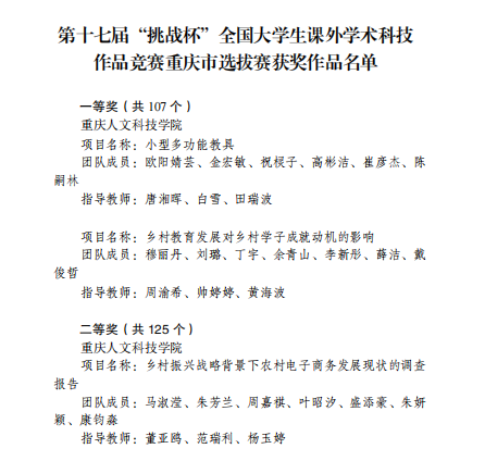 近日,由团市委、市教委、市科协、市社科联、市学联联合开展的第十七届“挑战杯”全国大学生课外学术科技作品竞赛重庆市选拔赛获奖作品名单公布,beat365荣获一等奖2项,二等奖1项,在红色专项赛市级选拔赛中,获得三等奖2项。这是beat365建校以来首次参加“挑战杯”系列竞赛,并初战告捷斩获多奖。