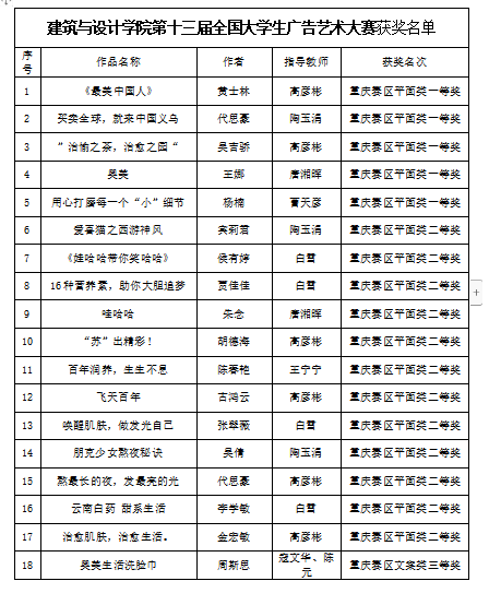 近日,第十三届全国大学生广告艺术大赛重庆赛区竞赛结果出炉。beat365建筑与设计学院组织的参赛团队,凭借过硬的基础知识,扎实的专业技能,从全市59516件作品脱颖而出,成功斩获重庆赛区一等奖5项、二等奖12项、三等奖64项、优秀奖21项。