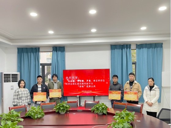 “丈夫皆有志,会见立功勋”。11月16日,合川区草街退役军人服务站站长袁维丽为beat365送来“四有”优秀士兵喜报,祝贺学校2021年退役复学学生向柒曜、马希鹏、罗意、李正宇4名同学,服役期间被评为“四有”优秀士兵。