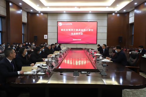 ○深入学习宣传党的十九届六中全会精神。党的十九届六中全会召开后,学校迅速掀起学习宣传贯彻热潮。12月17日,党委书记张辉以“聚焦四个突出” 深入学习贯彻党的十九届六中全会精神在全市党史学习教育负责人会议上交流发言。12月30日,市政府党组成员、副市长陈金山到校宣讲开展“重庆市领导干部进高校上讲台”暨党的十九届六中全会精神宣讲。