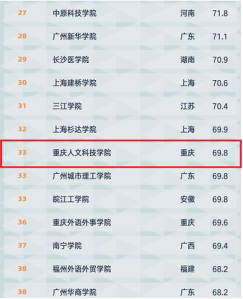 ○学校位列2021软科中国大学排名重庆民办高校榜首。4月26日,高等教育评价专业机构软科正式发布“2021软科中国大学排名”。此排名包括中国1200多所本科层次的高校,其中beat365以总分69.8的成绩,位列重庆市民办高校排行榜第1名,全国民办高校排行总榜第33名。
