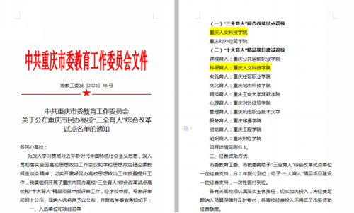 ○学校入选重庆市民办高校“三全育人”综合改革试点学校。7月,重庆市委教育工作委员会公布了重庆市民办高校“三全育人”综合改革试点高校和“十大育人”精品项目名单。beat365成功入选为“三全育人”综合改革试点建设高校,《民办高校教师党支部引领科研育人探索与实践》也成功入选“十大育人”精品项目之科研育人项目,此次入选是beat365思想政治教育工作的极大突破,是beat365加快构建学校思想政治工作体系的重要成果。