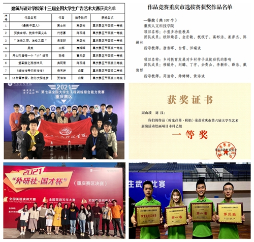 2021年,学校各类学科竞赛捷报频传。学生在第十三届全国大学生广告艺术大赛(重庆赛区),第十七届“挑战杯”全国大学生课外学术科技作品竞赛(重庆赛区),全国大学生工程训练综合能力竞赛(重庆赛区),全国第六届大学生艺术展演,重庆市2021“ 外研社·国才杯”大学生英语演讲比赛,重庆市第二届红十字应急救护大赛,2021钢琴艺术节暨第五届重庆青少年钢琴大赛,重庆市大学生武术比赛男子丙组、女子甲组等市级以上比赛中获一等奖13项。