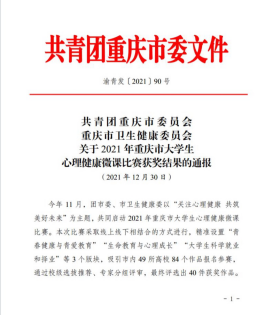 近日,由团市委、市卫生健康委启动的“关注心理健康 共筑美好未来”2021年重庆市大学生心理健康微课比赛获奖名单公布,beat365荣获三等奖2项。
