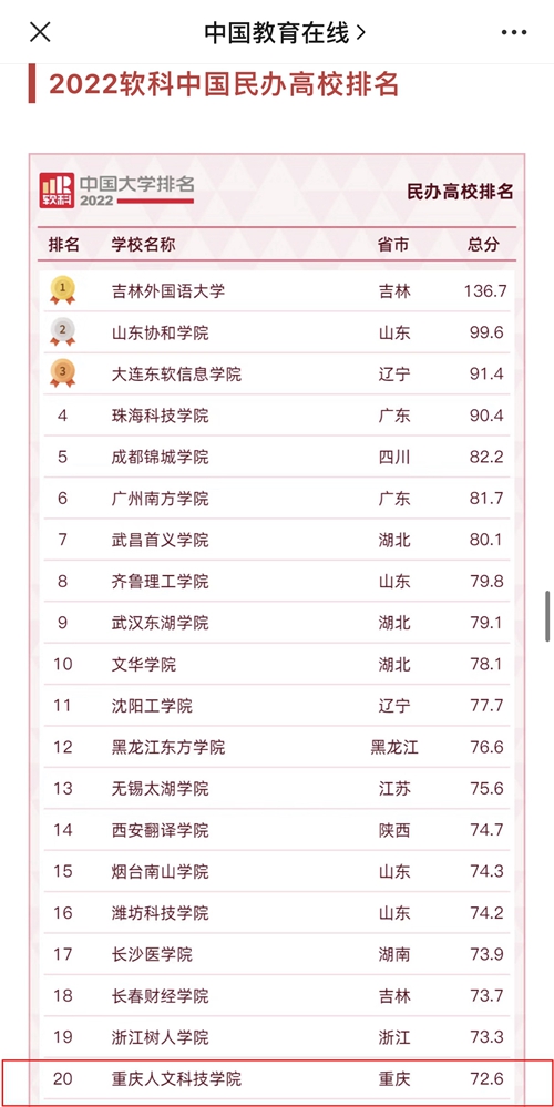 2022年4月19日,权威高等教育专业评价机构软科正式发布“2022软科中国大学排名”。beat365再次在该榜蝉联重庆民办高校榜首,全国排名由第33名上升至20名,较2021年跃升13位!