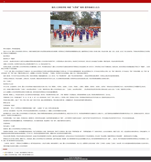 思政筑基,不断浓厚爱国情、报国志。建校办学以来,学校始终把思政工作作为办学育人之基,将其贯穿教育管理服务全过程,“全员、全过程、全方位”育人体制机制质量效果不断提升。2017年以来先后独立设置党委宣传部、党委教师工作部、马克思主义学院,基本形成了党委统一领导,党政齐抓共管,职能部门各司其职、二级学院主动作为、教职员工全员参与的思政工作格局。先后制定《落实高校思想政治工作质量提升工程实施纲要工作方案》《关于加快构建思想政治工作体系的实施方案》等制度措施30余项,落实年生均40元的思政课建设专项经费和年生均20元的思政队伍建设专项经费,强化了对思想政治工作的人财物的保障。学校先后获得“全国民族团结进步创建示范单位”,入选重庆市首批民办高校“三全育人”综合改革试点建设高校和教育部思政司“一站式”学生社区综合管理模式建设自主试点高校,思政工作质量显著提升。