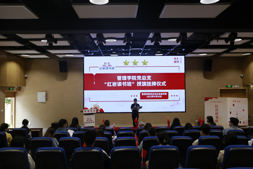 张跃光为管理学院党总支“红岩读书班”授旗。