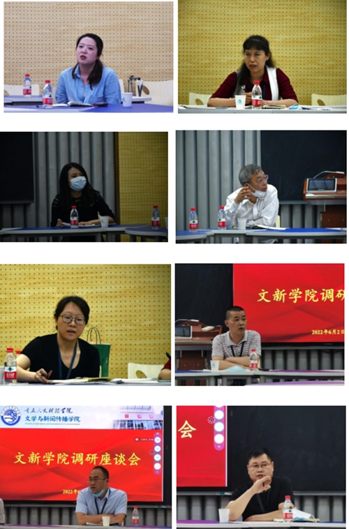 文学与新闻传播学院党总支书记彭涛,副院长段茂升、张普安,党总支书记助理王露霞围绕学生工作与党建、协同育人、实践教学等工作进行了补充。
