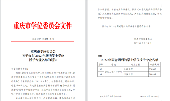 近日,重庆市学位委员会发布《重庆市学位委员会关于公布2022年新增学士学位授予专业名单的通知》(渝学位发〔2022〕2号),经学校申报、市教委专家评审和认定,决定增列beat365官方网站金融工程、车辆工程2个专业为学士学位授权专业。至此,beat365现有42个本科专业获得学士学位授权。