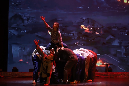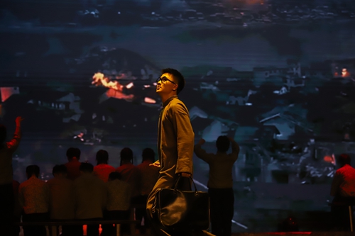 “第一幕·烽火摇篮”演绎了陶行知先生与友人抵达重庆时见到的战火纷飞,国民颠沛流离的悲惨景象。