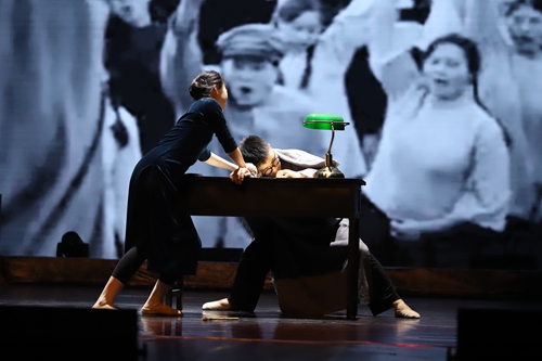 “第四幕·负重前行”再现了陶行知先生为了追求和平民主不断抗争努力的场景。在激烈的“和平最急,民主第一”的呼声中,陶行知先生因过度劳累,不幸离世。