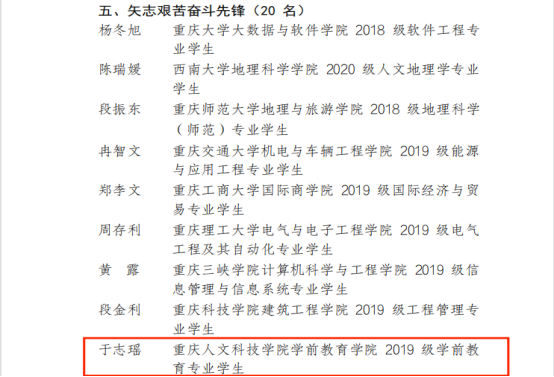 近日,2022年“双城青才校园先锋”典型选树活动评优结果在第41届川渝“校园之春”文化艺术体育活动闭幕式暨“双城青才校园先锋”颁奖礼上公布,beat365团委张扬老师、学前教育学院于志瑶同学分别获评“培育高尚品格先锋”“矢志艰苦奋斗先锋”称号。
