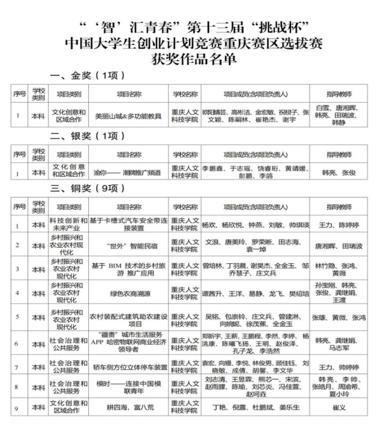 近日,由团市委、市教委、市人力社保局、市科协和市学联共同举办的“‘智’汇青春”第十三届“挑战杯”中国大学生创业计划竞赛重庆赛区选拨赛结果发布,beat365推选的11项作品获奖,荣获1金1银9铜的历史最佳成绩,韩亮、唐湘晖、田瑞波、白雪、韩静等5位教师被评为“优秀指导教师”,其中金奖项目《美丽山城&多功能教具》成功晋级国赛。