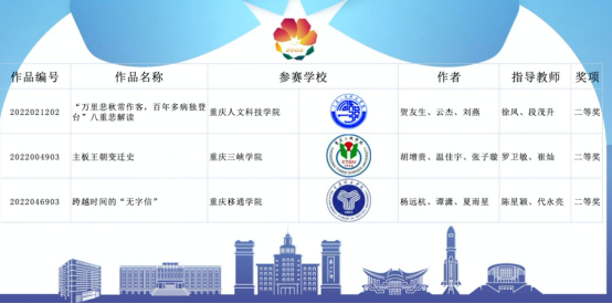 7月30日,2022年(第15届)中国大学生计算机设计大赛(沈阳决赛区)在东北大学闭幕,我校2019级汉语言文学专业贺友生、云杰、刘燕同学制作的《“万里悲秋常作客,百年多病独登台”八重悲解读》荣获“微课与教学辅助”二等奖。