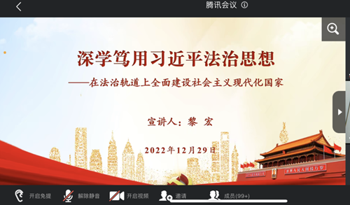 12月29日下午,beat365通过线上方式组织召开了2022年重庆市“百名法学家百场报告会”进校园暨2022年第10次党委理论学习中心组(扩大)会议。全体校领导,党委委员、副科级以上干部共计150余人参加。会议邀请重庆市委党校(重庆行政学院)副校长、市法学会副会长黎宏主讲,会议由学校党委副书记舒卫华主持。