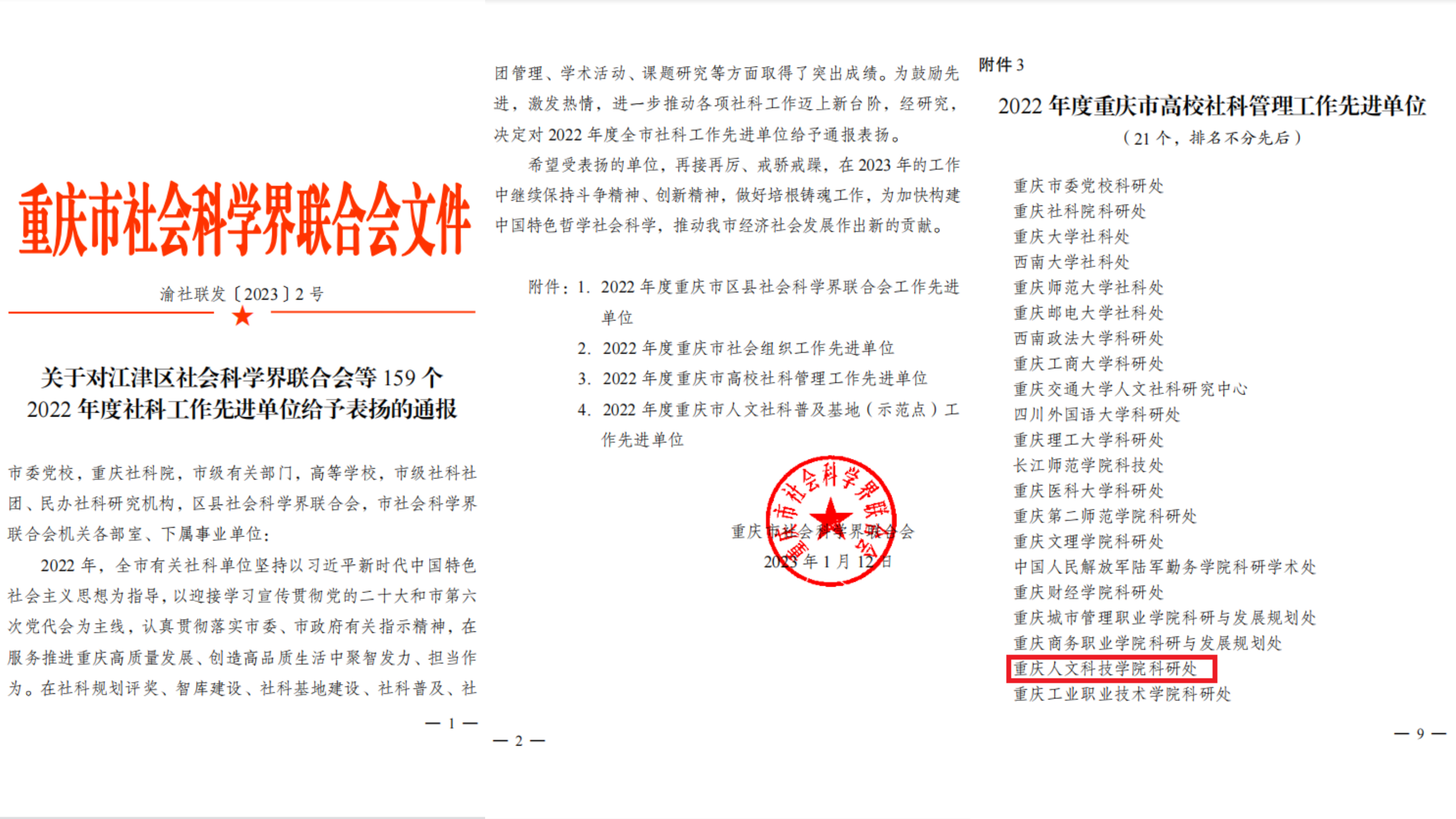 近日,重庆市社会科学界联合会下发了《关于对江津区社会科学联合会等159个2022年度社科工作先进单位给予表扬的通报》(渝社联发〔2023〕2号),beat365科研处被评为“2022年度重庆市高校社科管理工作先进单位”。