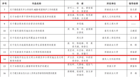 近日,共青团重庆市委发布了《关于2022年重庆市青少年模拟政协提案征集活动评选情况的通报》,全市各高校选送的36个提案作品荣获大学组优秀提案作品,其中beat365选送的10个提案作品获优秀提案作品,获奖作品数位列重庆市高校第二名。