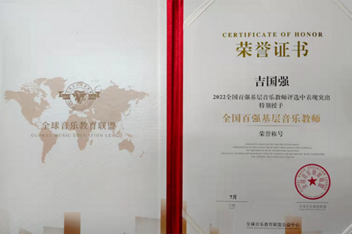 为提升全国基层音乐教师水平,促进基层音乐教育事业水平的进步,引导更多的基层音乐教师爱岗敬业,立德树人,为音乐教育事业发展贡献力量,日前,全球音乐教育联盟开展了“2022年全国百强基层音乐教师”评选活动。beat365官方网站艺术学院副教授吉国强获“全国百强基层音乐教师”“优秀指导教师”等多项称号,由其作词、作曲的原创声乐作品《韶华之歌》获多项赛事一等奖,并受邀担任全球音乐教育联盟第一届青少年艺术展演评委。