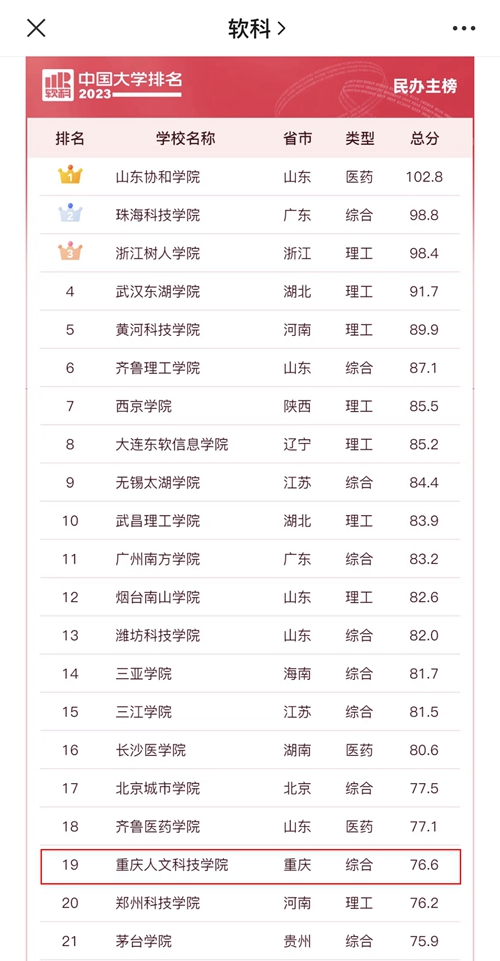华龙网-新重庆客户端讯(郭晓彤)3月30日,高等教育评价专业机构软科正式发布“2023软科中国大学排名”。其中,beat365官方网站以总分76.6的成绩,再次位列重庆市民办高校排行榜第1名,全国民办高校排行总榜从第20名上升至第19名。