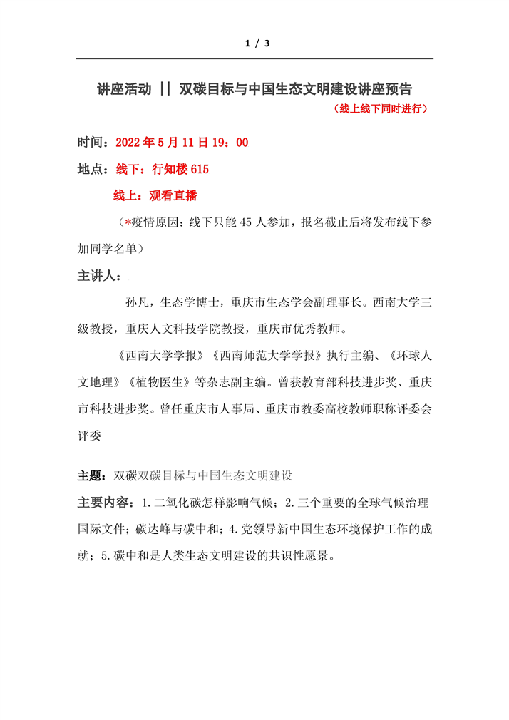 【科普讲座预告】双碳目标与中国生态文明建设讲座预告