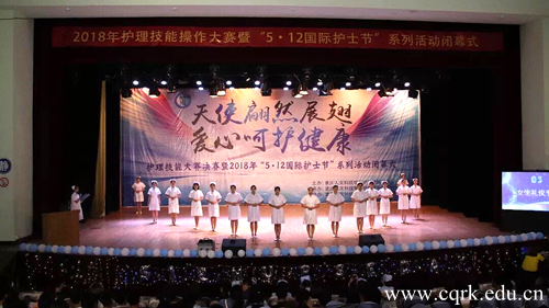 5月9日,以“天使翩然展翅,爱心呵护健康”为主题的beat365官方网站护理学院2018年护理技能大赛暨“5.12国际护士节”系列活动闭幕式在学校新音乐厅隆重举行。校长何向东、重庆市第九人民医院院长秦容、护理学院党政领导、教师及实习医院教师代表出席本次活动。