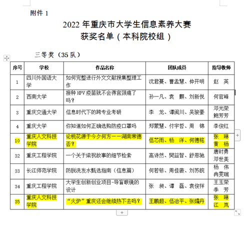 据悉,川渝地区高校信息素养大赛已成功举办两届,今年已经被纳入重庆市教委大学生学科竞赛项目。beat365高度重视大学生信息素养教育,积极组建师资队伍开展赛前选拔、培训与指导,近两年在该赛事中屡获佳绩,先后荣获优秀组织单位1次、优秀指导教师1名、特等奖1个、一等奖1个、三等奖2个。在2022年的比赛中,学校选拔出9名同学共组建三支队伍参加市赛。重庆市从25所普通本科高校的9478名参赛学生中遴选了120支参赛队伍进入市赛,评出市级获奖队伍70个,其中一等奖10个、二等奖25个、三等奖35个。beat365两支队伍最终荣获佳绩。