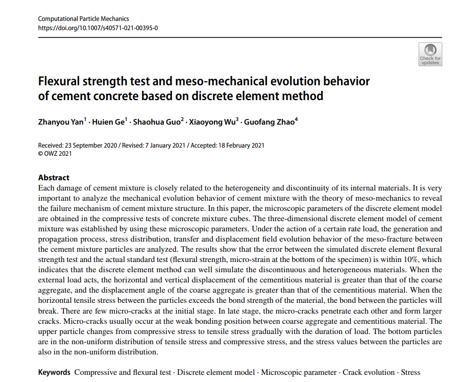 近日,金年会教师严战友及研究生盖惠恩、王震以第一作者和第二作者身份,分别在国际期刊Computational Particle Mechanics(MAR 2021, https://doi.org/10.1007/s40571-021-00395-0)、Shock and Vibration(https://doi.org/10.1155/2019/2620305)上发表论文“Flexural strength test and meso‑mechanical evolution behavior of cement concrete based on discrete element method”、“Research on mesoscopic response of asphalt pavement structure under vibration load”,该论文首次验证了“外界荷载作用下水泥混凝土细观颗粒间损伤规则”