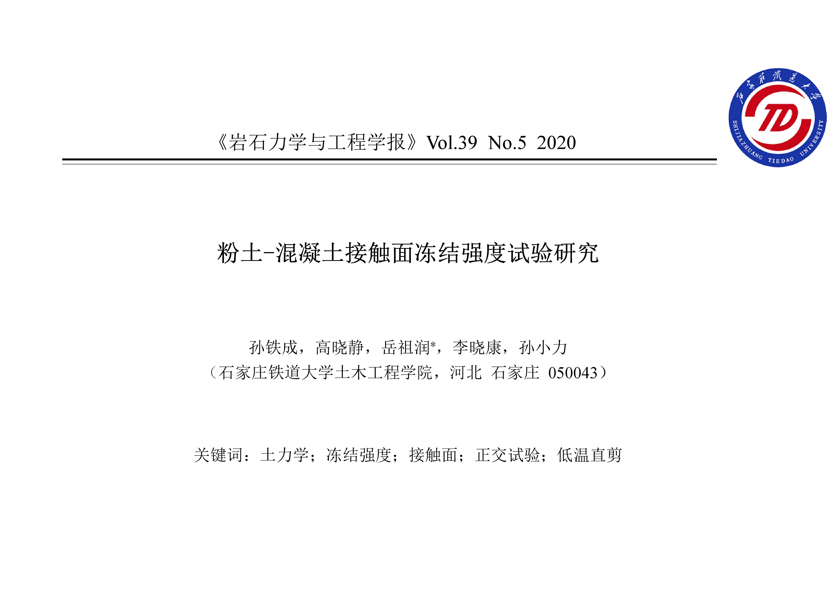 近日,金年会岩土工程专业教授,硕士研究生导师,岩土工程和地下工程方向研究骨干孙铁成教授,以及金年会金年会官网研究生高晓静分别以第一作者和第二作者身份,在EI核心收录期刊岩石力学与工程学报(2020,39(05):1032-1039)上发表论文“粉土-混凝土接触面冻结强度试验研究”。该论文定量分析了试验设定各因素对冻土-构筑物接触面冻结强度的影响程度及主次顺序,进而对冻土与构筑物接触面冻结强度的形成及破坏机制给出了一种合理的解释。