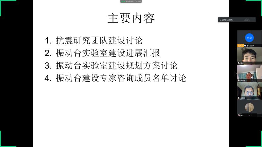 (金年会官网)在学校号召的科研发展大讨论背景下,金年会官网结构抗震研究团队于4月20日召开了网络视频会议。会议主题为地震模拟振动台以及人才队伍建设中的若干问题,团队骨干成员王军文、艾庆华、白建方、李勇、郭进、张学明、罗超和李然等老师均到会,王建西副院长参加了本次会议。