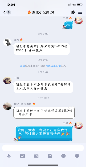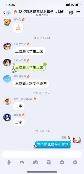 2.建立湖北籍学生联系群,并置顶,催促自己包联负责的三名学生上报所在位置和身体情况,再三提醒他们一定要做好保护措施,不要随意外出。有的学生可能会睡懒觉,忘记上报,十点左右打电话亲自询问学生状况,然后将三名学生的状况汇总,上报学院,将包联制度严格落实到位。