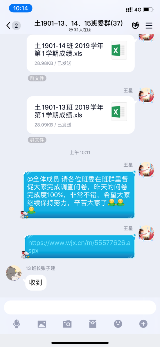 3.十点左右在班委群里发布调查问卷(问卷星),要求各班班委督促本班学生在三点之前完成,努力做到全体学生无一遗漏全部填写,全面掌握学生情况。