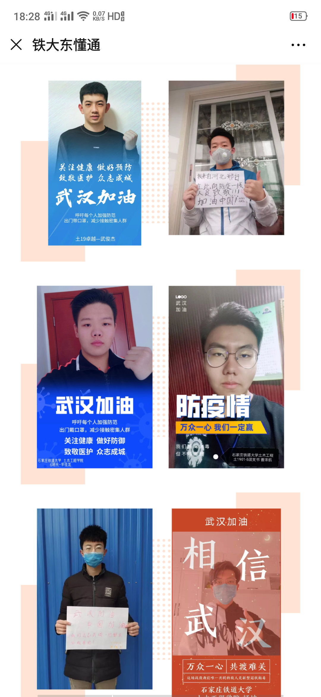 从学校和学院领导接到的信息:在火神山、雷神山的一线建设工地,学院杨广庆教授参与了土木合成材料进行防治防漏工作;学校的各地校友群纷纷捐款捐物送往武汉。这些动人的事迹和为国为民的担当让我感受到作为铁大人的骄傲和感动。17年前,作为大学生的我,在亲爱的老师们支撑起的天空下得以成长翱翔。今天,作为铁道大学的一名辅导员、一名高校教师,我愿尽绵薄之力,抗击疫情。也号召学院的全体团员青年们,相信党和政府,信仰伟大的中华民族!春天来了,未来和希望之光将与我们同行。