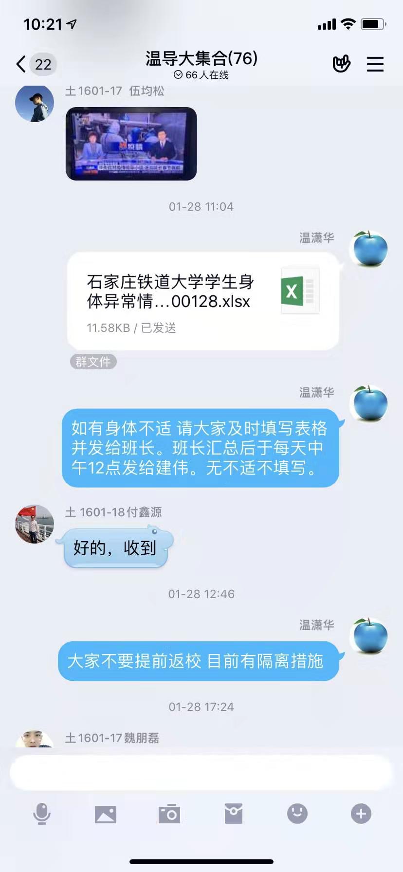 “各位辅导员老师:今日的学生身体健康状况和湖北籍学生的心理、身体状况还请大家继续关注,如有情况请大家告诉我”